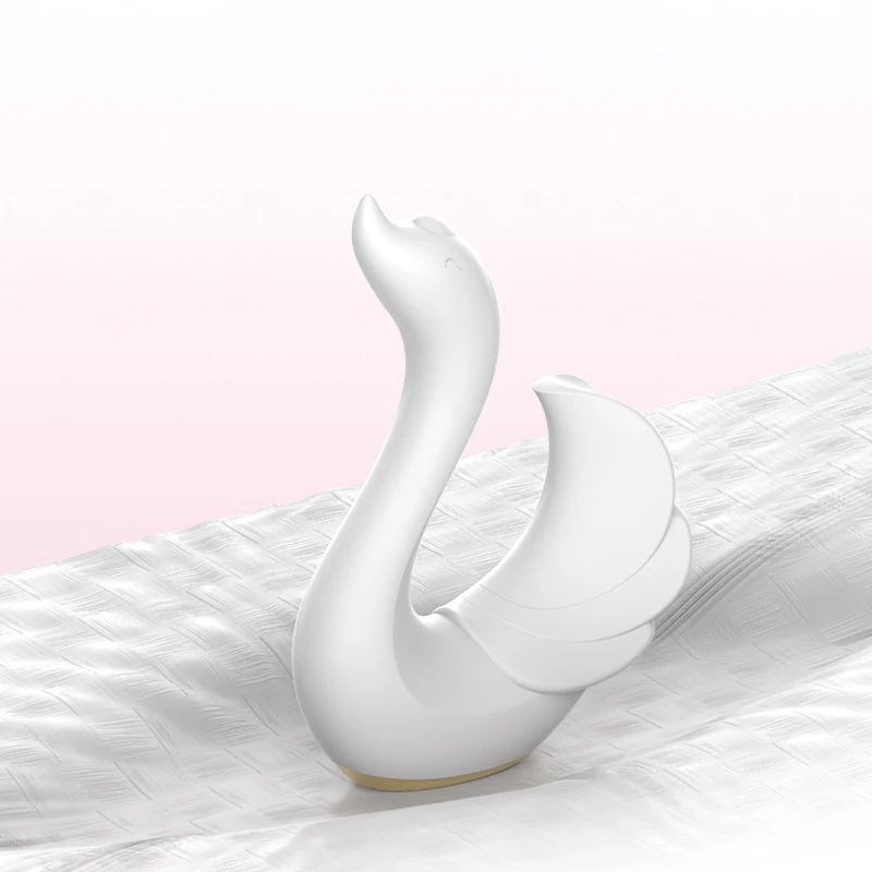 Elegant white swan-themed vibrator resting on a podium, showcasing its artistic aesthetic and premium body-safe silicone finish.