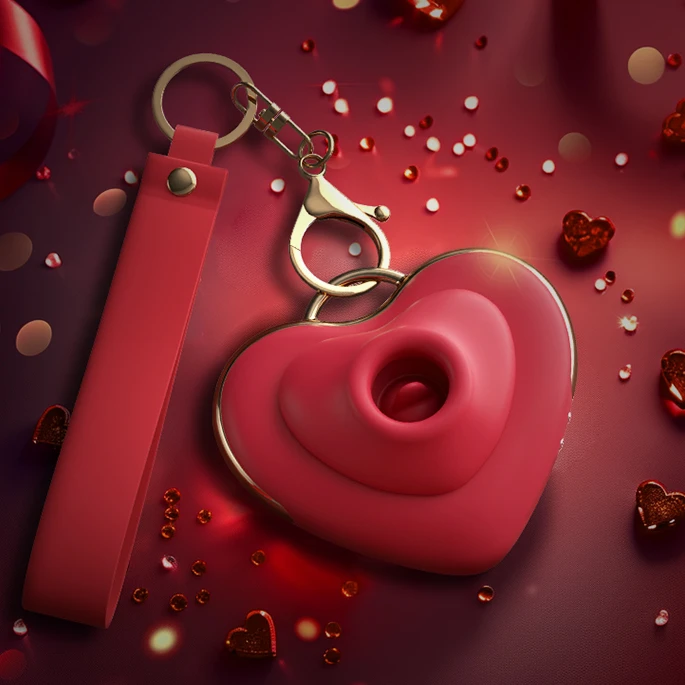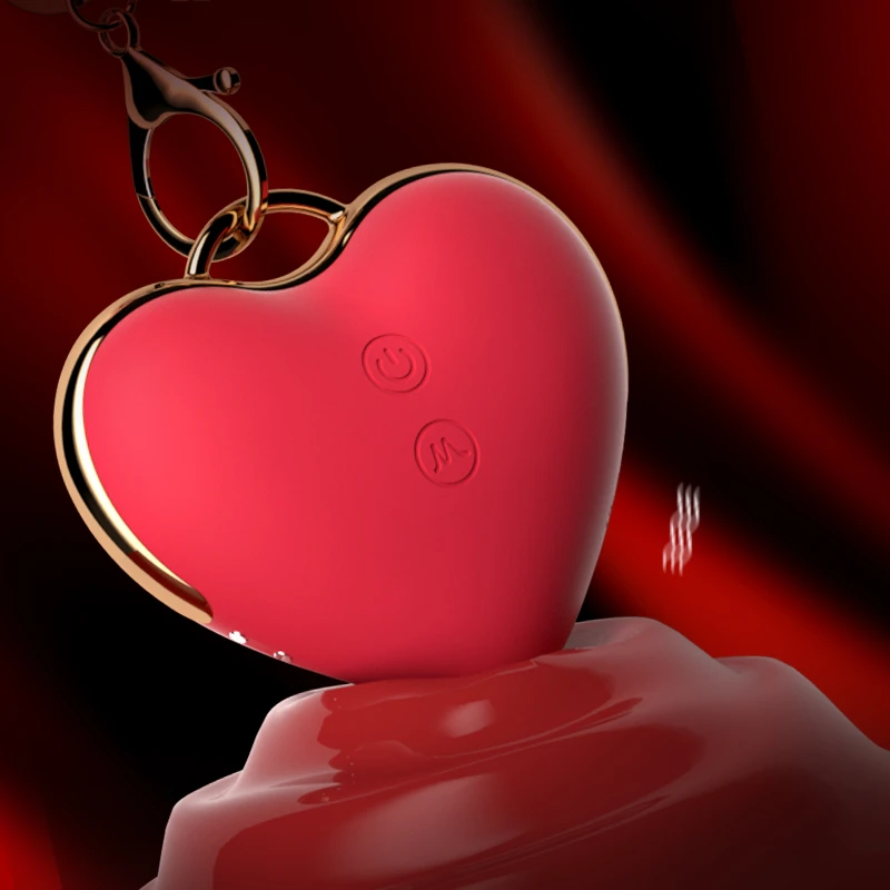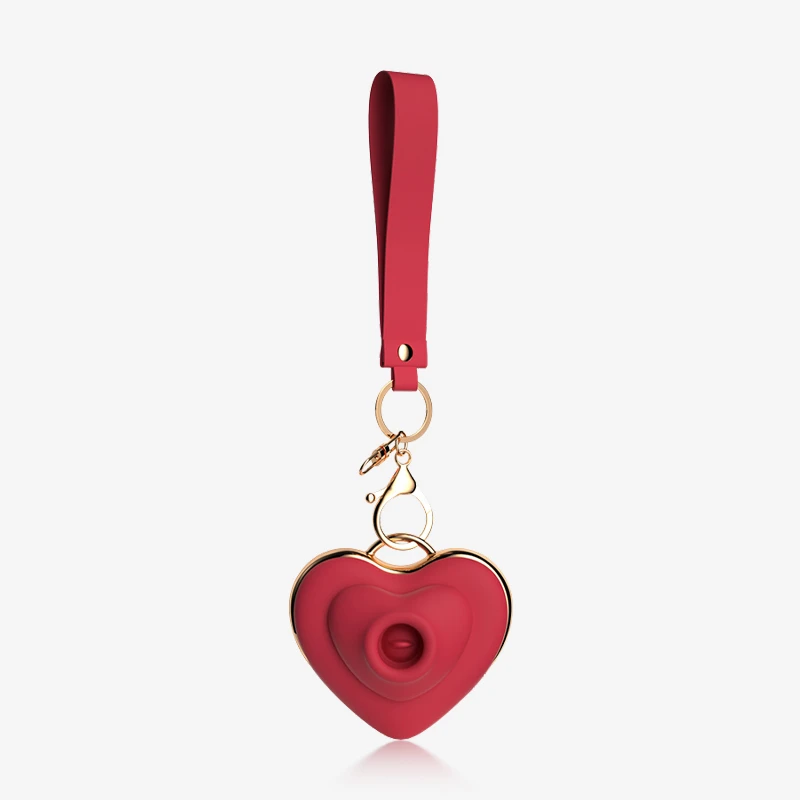 A heart-shaped licking vibrator in vibrant red featuring a gold-toned keychain attachment for discreet, on-the-go portability.