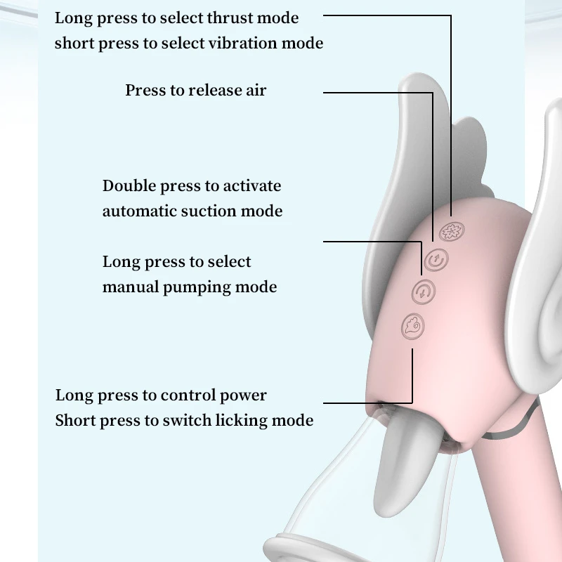 Infographic showcasing the multifunctional capabilities including constant thrusting, tongue tip swinging, strong vibration, and vacuum suction.
