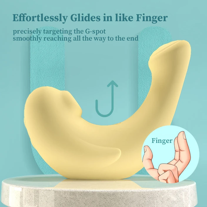 Side profile of the dual-stimulation massager sitting on its charging dock, highlighting the curved "u-shape" designed for simultaneous internal and external pleasure.