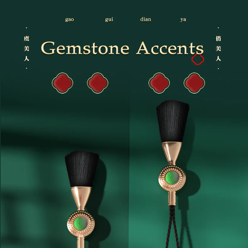 Close-up of the "Fun Little Tail Brush" accessory featuring soft black bristles and a decorative green gemstone inlay for sensory play.